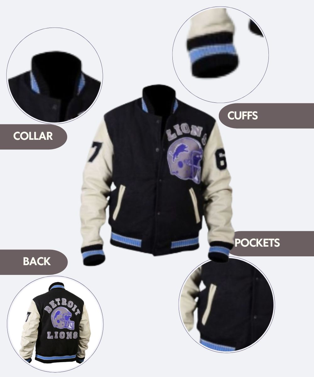 Choosing the "Detroit Lions Jacket" is to go for quality, style, and the real deal. We craft our jacket with premium materials like wool and leather which in turn gives you durability and comfort. We have a classic yet very modern design which includes the great black and white theme perfect for any occasion. We put our customers first, we offer a variety of sizes to fit all body types also we included a soft viscose lining for extra warmth and comfort. We pay attention to the details in everything we do from the ribbed collar and cuffs to the button up closure and useful waist pockets. By choosing us you’re not just getting a jacket you’re investing in a symbol of Detroit Lion’s pride and a piece of quality craftsmanship.