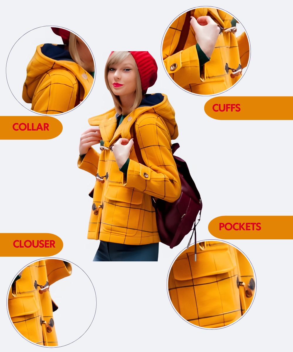 Channel classic appeal in the Paddington Bear Yellow Taylor Swift Coat which we present in premium wool and a smooth viscose line for ultimate comfort. It’s the toggle button closure, hooded style collar, and bright yellow color that bring out the fun yet put together feel which is a take from Taylor Swift’s signature style. We have gone in for full length sleeves, rounded off with button up cuffs and we also included practical storage in the form of two outside and one inside pocket which is a great touch. This paddington yellow coat is the definition of fashion and function. Whether you are out for a light run around or making a grand style statement, this paddington bear yellow coat has what it takes to make you stand out in elegance and warmth.
